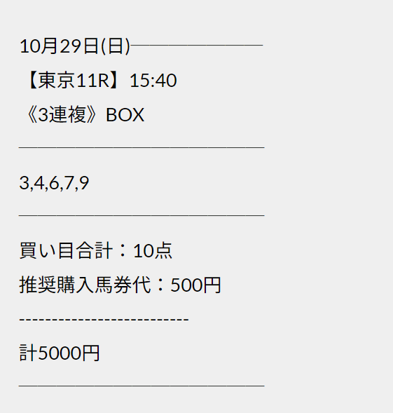| 10月29日 | 東京11R | 3連複 | ¥5,000 | 的中 | ¥10,900 | ¥5,900 | ¥-10,850 |