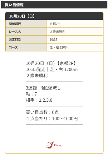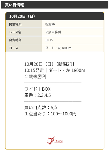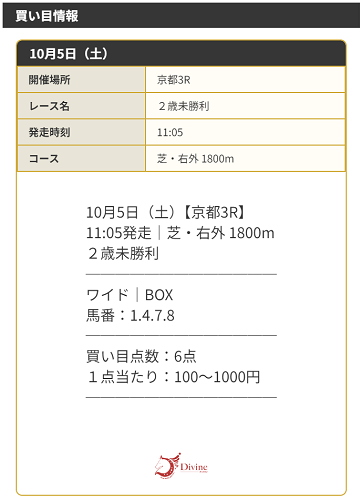 「ディバイン(Divine)」の無料情報は複数券種から選べる形式となっていた為、的中精度と回収精度を共に見極めるためにワイド/3連複を選択。買い目にはそれぞれ推奨投資金額が記載されておりましたので、買い目通りにそれぞれ1点1,000円ずつ馬券を購入いたしました。