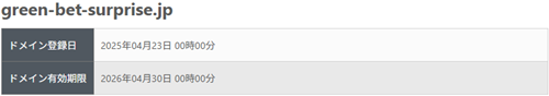 またドメイン名である「green-bet-surprise.jp」が取得されたのは「2025年4月23」となっておりましたので、実際に運営を開始したのはそれ以降ということで間違いなさそうです。