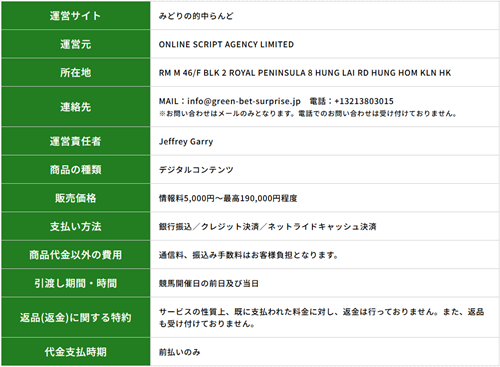 「みどりの的中らんど」の運営会社の欄には「ONLINE SCRIPT AGENCY LIMITED」と記載されており、所在地は「RM M 46/F BLK 2 ROYAL PENINSULA 8 HUNG LAI RD HUNG HOM KLN HK」(香港)となっているため、海外法人であることが分かります。