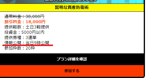 無料情報は前日20時公開、ポイント情報は当日8時公開、有料情報は当日9時公開となっており情報によってそれぞれ公開時間が異なるのでもし参加する場合は間違えないよう注意が必要です。