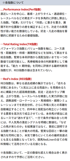 RED指数は実質的に「競馬レッドライナー」という競馬予想サイトの無料予想となっているようで、内容としては「Performance Index(Perf指数)」という指標と「Total Rating Index(TR指数)」という指標を無料で情報公開しているようでした。