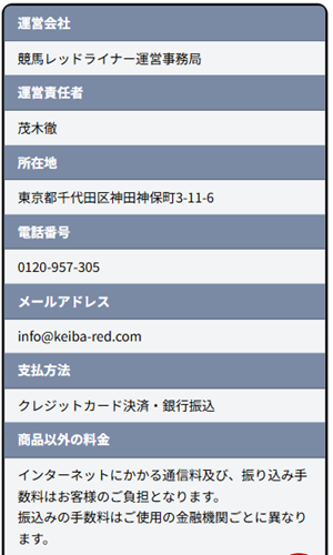 「競馬レッドライナー」という競馬予想サイトの特定商取引法に基づく表記を見てみました。