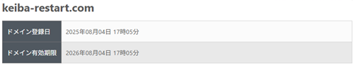 またドメイン名である「keiba-restart.com」が取得されたのは「2025年8月4日」となっておりましたので、実際に運営を開始したのはそれ以降ということで間違いなさそうです。