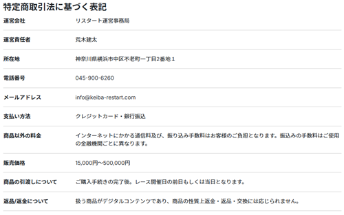 「リスタート」という競馬予想サイトの特定商取引法に基づく表記を見てみました。