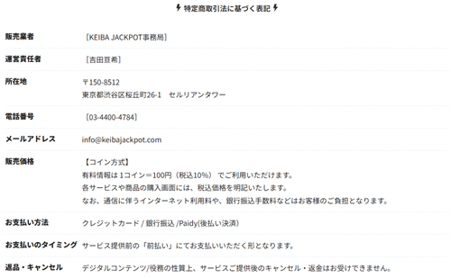 「競馬ジャックポット」という競馬予想サイトの特定商取引法に基づく表記を見てみました。