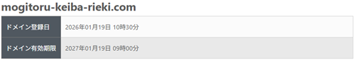 また、ドメインである「mogitoru-keiba-rieki.com」が取得されたのは「2026年01月19日」となっておりましたので実際に運営開始したのはそれ以降ということで間違いなさそうです。