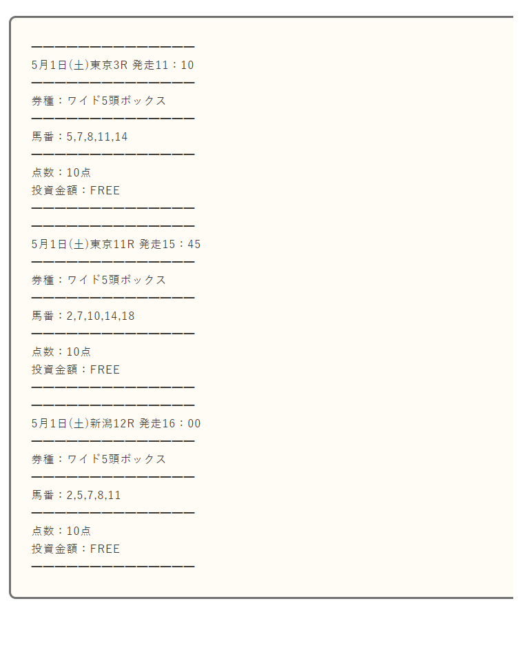 券種はワイドBOXとあまり配当を狙う形ではなさそうですが無料情報ということもあり、まずは手堅く的中率を狙っていく形でしょうか。