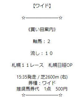 | 8月6日 | ワイド | 札幌11R | 的中 | ¥500 | ¥1,650 | ¥1,150 | ¥-3,350 |