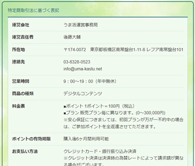 「うま活」の特定商取引法に基づく表記を見てみました。