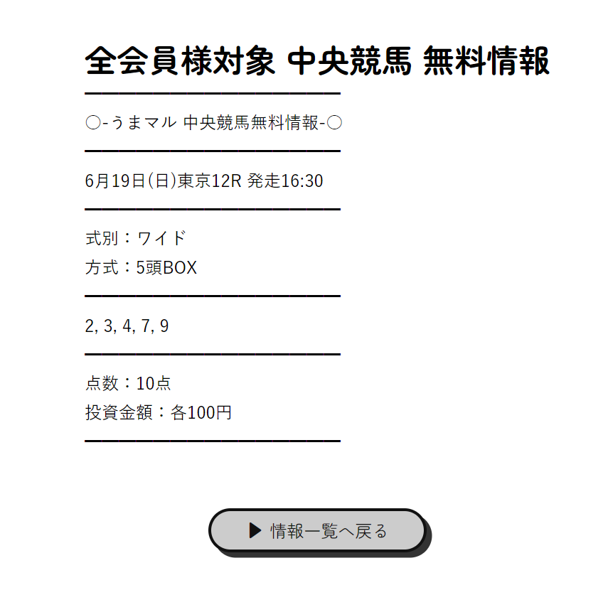 「うまマル」には無料情報もあるようですのでまずは無料情報に参加することで「うまマル」の予想実力を判断してから有料情報への参加を検討していく形でも遅くはないでしょう。