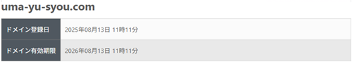 またドメイン名である「uma-yu-syou.com」が取得されたのは「2025年8月13日」となっておりましたので、実際に運営を開始したのはそれ以降ということで間違いなさそうです。