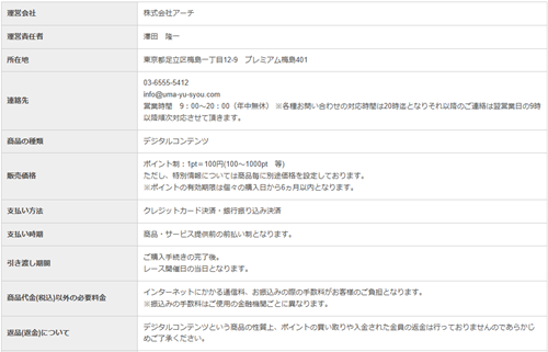 「うま遊勝」という競馬予想サイトの特定商取引法に基づく表記を見てみました。