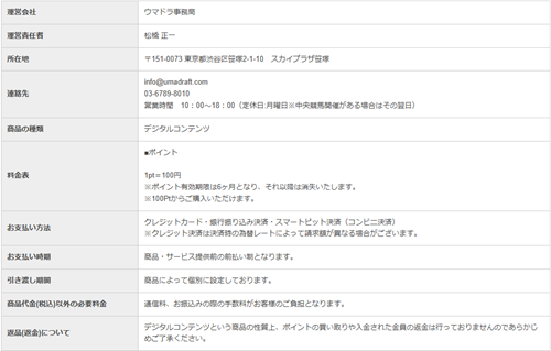 「ウマドラ」という競馬予想サイトの特定商取引法に基づく表記を見てみました。