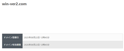 またドメイン名である「win-ver2.com」が取得されたのは「2025年8月22日」となっておりましたので、実際に運営を開始したのはそれ以降ということで間違いなさそうです。